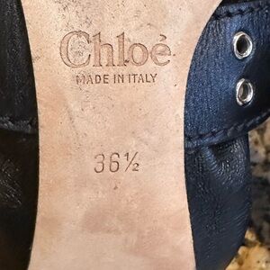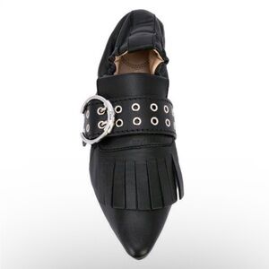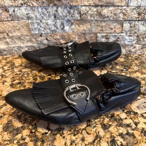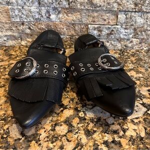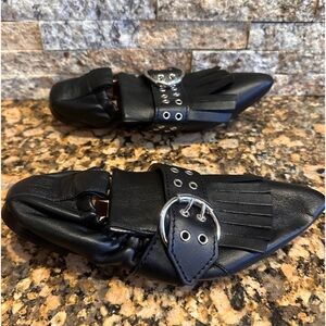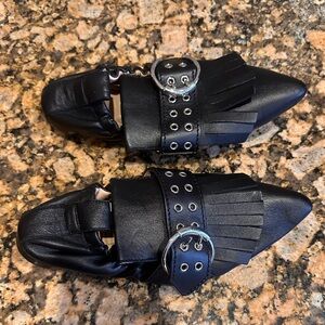 Black leather Kiltie shoes with silvertone buckle grommets and hardware. Pointed pointy toes. Slip on style. Elastic back. Leather soles.