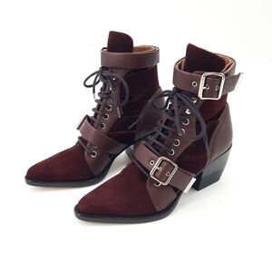 Bold, modern, and effortlessly chic, the Chloé Rylee ankle boots blend feminine curves with a touch of boyish, western-style edge. Crafted from suede and domestic calf leather, the boots feature a cut-out graphic upper, padded straps, and signature roller buckles for a subtle rock ‘n’ roll attitude. The sturdy western heel, made from stacked leather and matte rubber, adds height while keeping them wearable all day.
