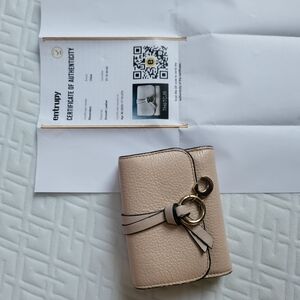 This Chloe wallet showcases a sophisticated tan leather exterior with a pebbled texture, complemented by gold metallic accents. Its minimalist design features a unique closure system with a leather strap and metallic ring, offering both style and functionality. Pristine Condition, COA is included!!!!