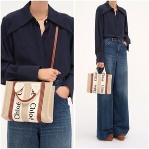 Logo-adorned straps and rich leather trim adds interest to this roomy canvas tote bag.