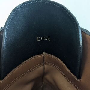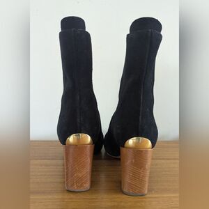 Description: Chloe Crosta Cardiff Suede Wood Heel Booties 35 1/2 , gold/brass detail on the heel, pull tab in the back, made in Italy, timeless almond shpaed toe, some wear on the soles but she still has many more steps to go, ships without box