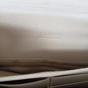 Stylish Chloe wallet. Features green, peach, and beige panels. Elegant and versatile design.