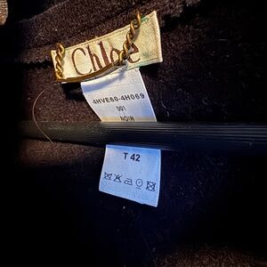Size 42. In perfect condition. Beautiful wool jacket. 100% AUTHENTIC VINTAGE CHLOE BLACK CROPPED WOOL JACKET with scoop neck, long sleeves, scalloped hemline, dual flap pockets at chest and concealed snap closures at center front, and pockets. Only worn a few times. Looks great on.