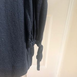 This dress is stunning! It is 70% woo and 30% silk. The neck has a beautiful lace inset. It has drapey sleeves with ties at the end. It hits just above the knee. Extremely flattering!! Like new condition.