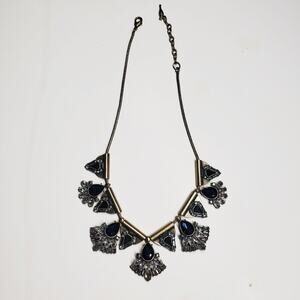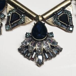 This is a beautiful Chloe and Isabel 'Monarch' statement necklace. The necklace is antiqued gold tone in color and features clear and deep blue glass stones.