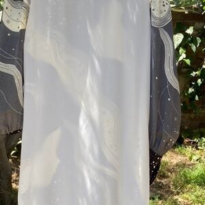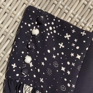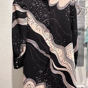 Chloe mini dress Black and off-white galaxy inspired print with female profiles. Long sleeves have slight puff at shoulders and are loose throughout with tighter long cuffs that button. Dress is lined and has pockets. Zipper in the back. Small stains noticeable in several spots.