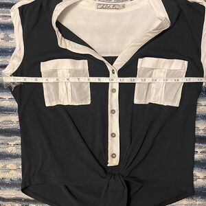 Good preowned condition: Chloe K cute, black & white crop top with front tie size M. This top is very soft and is cute on.