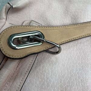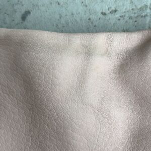 The actual bag is in good condition but as you see from the pictures, it needs some touchup. Measuring across the bottom is 18” x 11.5 x 3.5. Interior needs cleaning and the small interior pocket has an ink stain. Pale pink with tan handles.