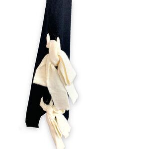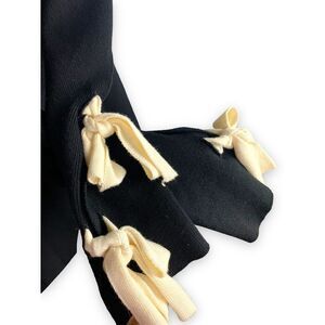 This dress is simple but so elegant. Long sleeve black sweater dress. Cream colored knit sleeve closures, two bows on each arm. Stretchy.