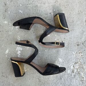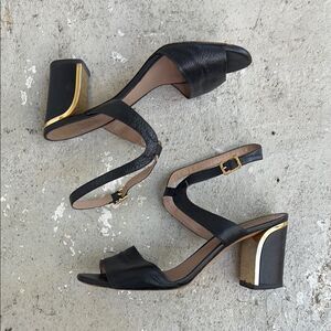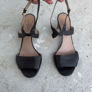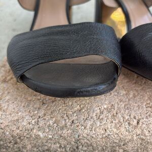 Check out the pictures, these wrap around the ankle. They are not perfect, but they are still good. Tow has scuffing which I show in pictures which I have colored so it is less visible Heel height is approximately 2.5 inches.
