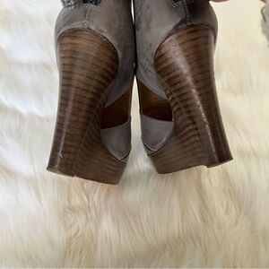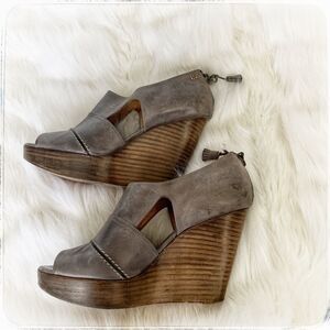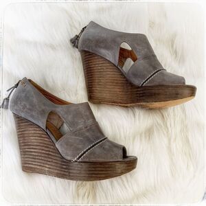 Chic thick strappy grey leather Chloe wedges. Wood wedge. Good preowned condition with some scuffs throughout and slight wear to insoles and some wear to soles as shown. Tons of life left. Heel height approx 4” with 1” platform. All measurements are approximate