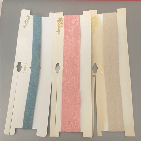 Brand new chockers from Charlotte Russe. 1 blue, pink lace, cream one and a gold with diamonds