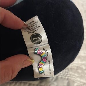 Adorable black cat plush with a blue scarf. Features cute yellow ears and big eyes.