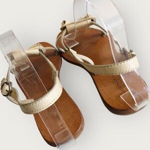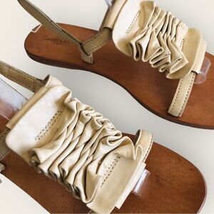 Chocolat Blu ruched leather sandals in excellent gently used condition. Bone colored leather uppers, ruched vamp, adjustable ankle buckle, leather soles. Made in India.