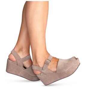 Stylish suede wedge sandals. Adjustable buckle strap. Comfortable platform design.