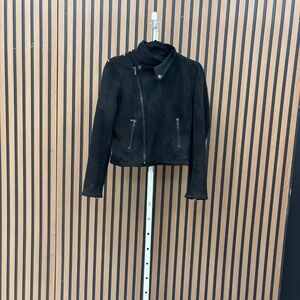 Sleek black leather jacket with a customized embellishment of Prince modern design. Features zippered pockets and a stylish collar.