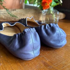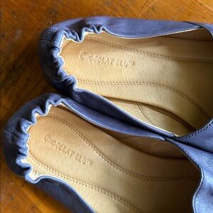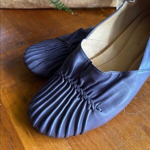 Chocolate Blu Pin tuck leather comfort flat with elastic back heel in a graphite/gray blue leather. Beautiful and unusual design. Size 10 Wide