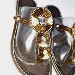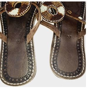 Chocolate Brown Boho Handbeaded leather flip flop flat sandals. Crafted by Masai women from Kenya & Northern Tanzania hand crft each beaded piece. Each pair are different and unique. History: The Masai have been creating bead jewelry for a long time, long before their first contact with Europeans and the beadwork an individual wears will signify their age and social status due to the colors of beads.