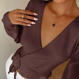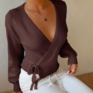 Chocolate Brown Casual Women's Wrap Tie Front Cardigan
