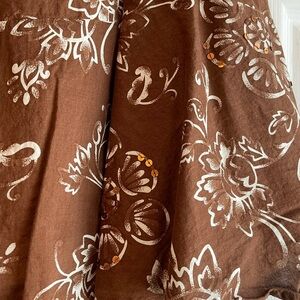 Chocolate brown skirt with tan/cream floral pattern and sequin embellishments. Size 14. It is lined and has a hidden side zipper with a hook at the top. Gently worn. No stains, smoke free home.