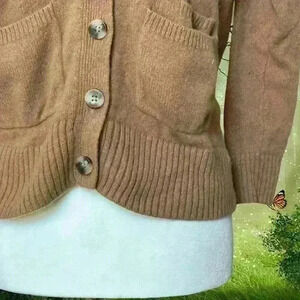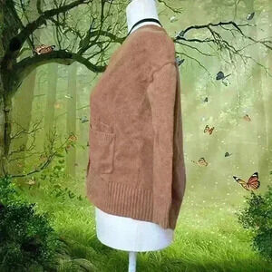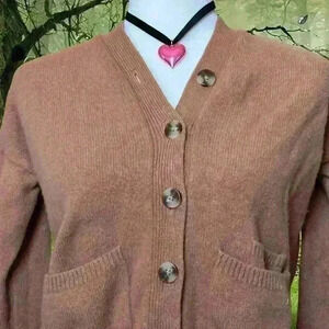 Cute chocolate brown cashmere cardigan, has three from pockets, semi big buttons that give it a classy look, super soft and comfortable material, perfect transitional piece to fall, 70% recycled cashmere, 30% wool. Brand: Madewell