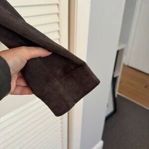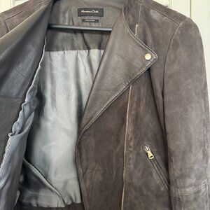 Rare find! This jacket is a mix of dark brown suede and leather in a more elegant version of a moto-jacket. Hardware accents are gold. This jacket is in fantastic shape. The only signs of wear are a slight creasing on the ends of the cuffs where I turned them up (I'm petite!). Non-smoking home.