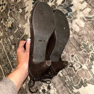 Soft chocolate suede with that moody, late-2000s energy everyone’s suddenly obsessed with again. These heeled ankle boots feature a pointed toe, foldover cuff, and lace-up detailing with little brass eyelets that give them that witchy, romantic, slightly-dangerous touch. The heel has that sculpted vintage curve that makes your walk look intentional, even if you’re just going to the mailbox.