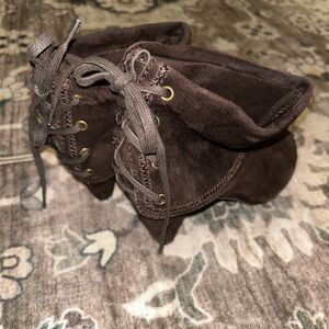 Chocolate Brown Suede Lace-Up Foldover Heeled Ankle Boots Y2K Witchy Pointed Toe