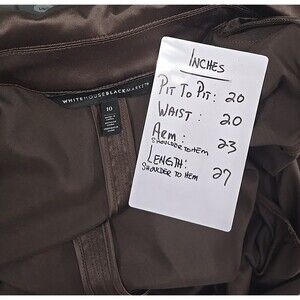 The White House Black Market Suit for women in size 10 features a stylish pant suit design in a sophisticated brown color. The jacket has a long length with a notch lapel style and no button closure, while the pants are tailored with a belted waist and stretch material for comfort. Ideal for various occasions such as formal events, business meetings, or even casual outings, this two-piece suit is perfect for the modern woman looking for a classic and timeless ensemble. Made from a blend of polyester and spandex, this lightweight and stretchy suit is a must-have addition to any wardrobe.
