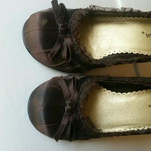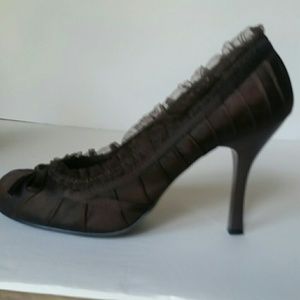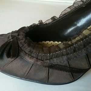 Adorable chocolate brown satin heels with ruffled tulle & a little bow! Only wore once Feel free to make an offer!