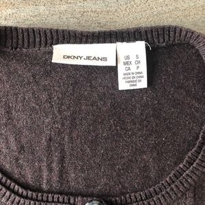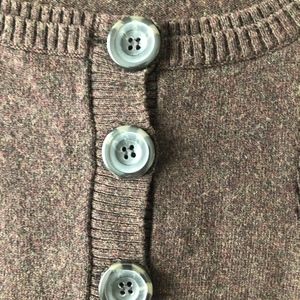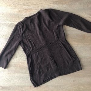 Dark brown, button up, scoop neck sweater with cinched waist.