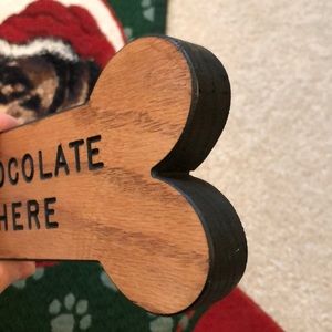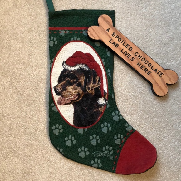 Tapestry Christmas stocking with chocolate lab and oak bone shaped sign. Like new condition.