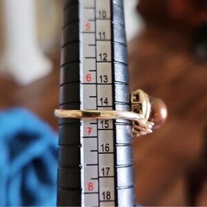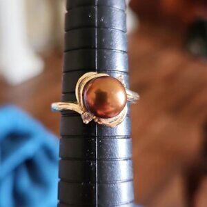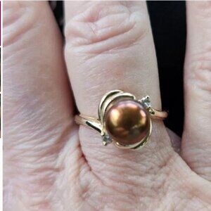 This ring was made special for my aunt at the store I worked at. Beautiful and stylish. Pearl is 5 mm and is set in 14 kt Gold. The size is shown on the mandrel and is somewhere between a 6.5 and 6.75.