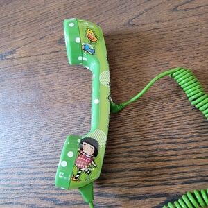 Headset plugs into headphone jack. If using with a newer iphone you will need doggle adapter bc I dont think they have headphone jack. Able to talk, adjust volume and answer/reject calls with this cool "old school" phone. Actual headset is green with graphics. Fun and funny. this is used and not in packaging any longer. last photo is of the packaging it came in