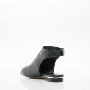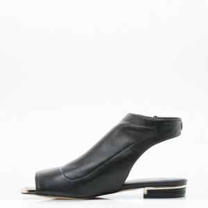 Leather slide with easy to use closure at heel and gold detail on heel and at toe.