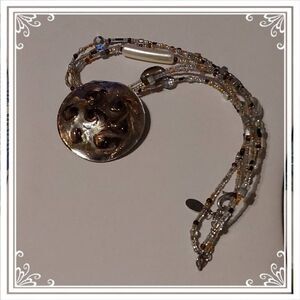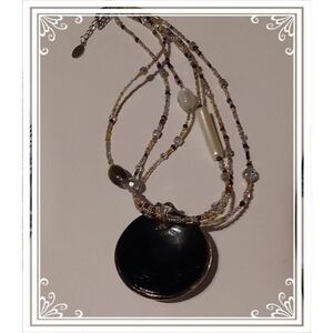 Beautiful handcrafted necklace features a 2" diameter round pendant done in Italian murano glass and a beautiful swirl design. It hangs on a triple strand necklace done in faceted crystals, seed beads and a tubular mother of pearl gemstone. It is 18" in length with a 3" silver chain extender and lobster claw clasp closure.