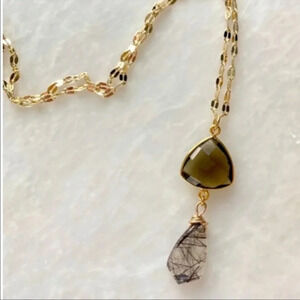 Chocolate Topaz & Rutile Quartz pendant electroplated in 18k gold and on a 22k electroplated specialty 18” chain. Includes a lobster claw closure and Estrella & Luna jewelry tag. Pendant measures approximately 1.5” long and .5” wide.