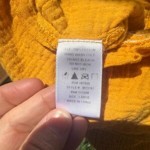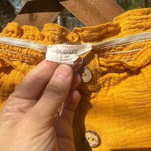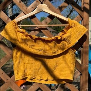 Ruffled off-shoulder crop top with button-front detail. Soft textured gauze fabric for a breezy feel. Bright yellow hue for a sunny appearance.