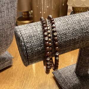 Two of these beautiful chocolate-finished bracelets have raised beads and bezel set CZ stones alternating. The third bangle has raised beads alone. Striking. Inside diameter of 2 3/4” and they will fit up through and including a 7 1/2” wrist.