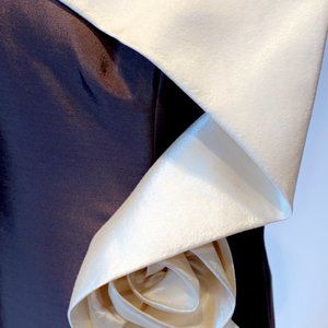 Ivory on chocolate satin and silk dress with a rose-shaped bow. Size 10