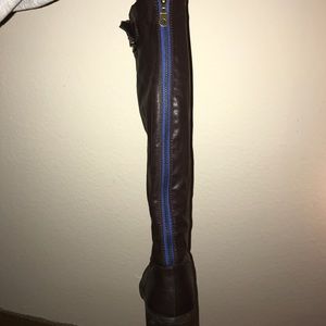 Chocolate brown boots with blue zipper.