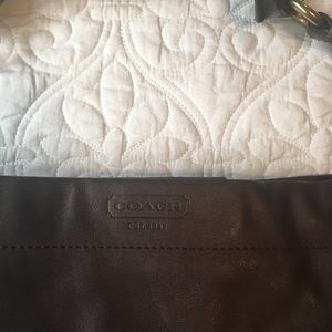 Moderately used brown leather Coach handbag. Leather is quality, weatherproof leather. Will last a lifetime. Inside had a few minor stains from moderate use over a couple of years. Comes with Coach dust bag.