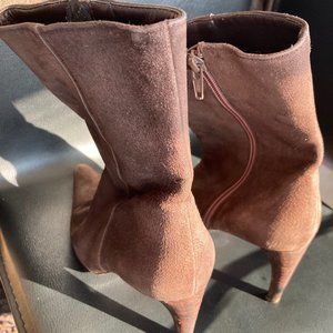 Thin suede hugs your foot like a glove. Easy zipper for on/off. Looks great with tight jeans. Can't walk in heels like these anymore. Sole says Made in Spain 8 1/2 M Discounted greatly for tiny chip in one of the heels.