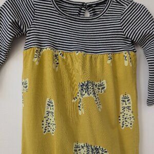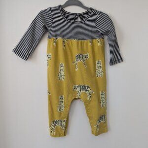 Tea Collection is so quality. This onepiece/ mixed print romper is comfortable and soft, but looks nice enough for a special occasion. Black and White striped top with a Gold bottom half with printed big cats. Worn once. Machine Washable with buttons along the legs and inseam for easy diaper changes.