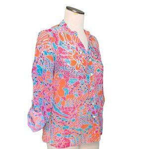 Choices Colorful Mesh-Linen Blend Button Front Roll Tab Top Sz S 102A