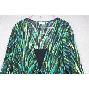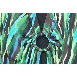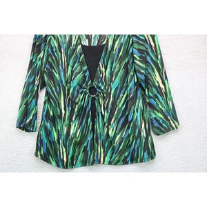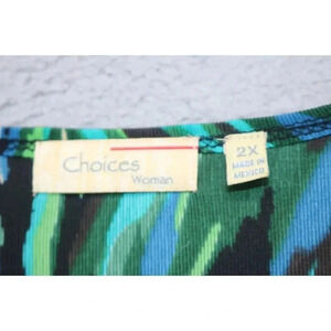 This is a Choices Liquid Knit Top that is a size 2X Plus Size. It has 3/4 sleeves and a V-Neck with an insert. It is 96% Polyester and 4% Spandex. Laying flat, it measures: Armpit to armpit-24.5" and the length is 28.5". It is in great condition.