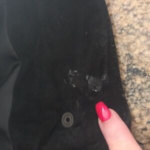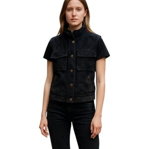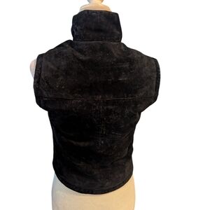 Stylish black suede vest with zip front and snap closure. Ideal for layering. Adds a touch of elegance.