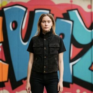 Choices Y2K Black Suede Leather Vest Quality Unisex Zip Snap Front Sz S