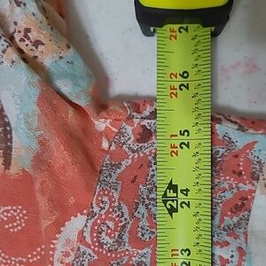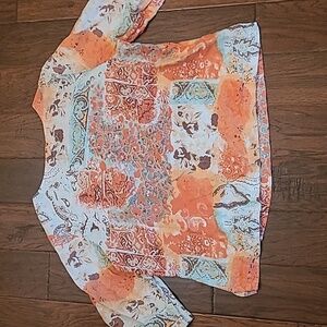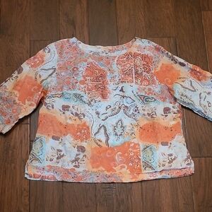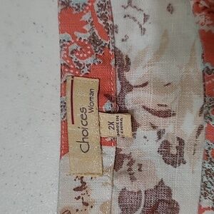 Choices women's colorful linen blend top size 2X. Vibrant women's top features a stunning design in orange, blue, and cream hues. Perfect for adding a pop of color to your wardrobe.