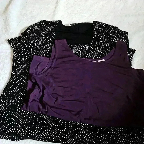 Never worn. Both armpit to armpit 20". 95% Polyester 5% Spandex. The tank is a deep purple. Both feel amazing